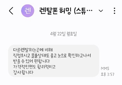 다른 렌탈하는 곳에 비해 직접오시고 물품 상태도 좋고 눈으로 확인하고 나서 받을 수 있어 편합니다.