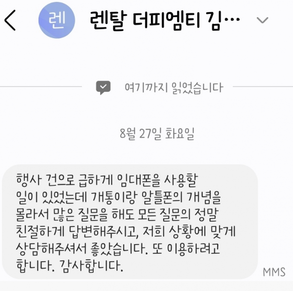 행사 건으로 급하게 임대폰을 사용할 일이 있었는데 개통이랑 알뜰폰의 개념을 몰라서 많은 질문을 해도 모든 질문에 정말 친절하게 답변해 주시고, 저희 상황에 맞게 상담해 주셔서 좋았습니다.